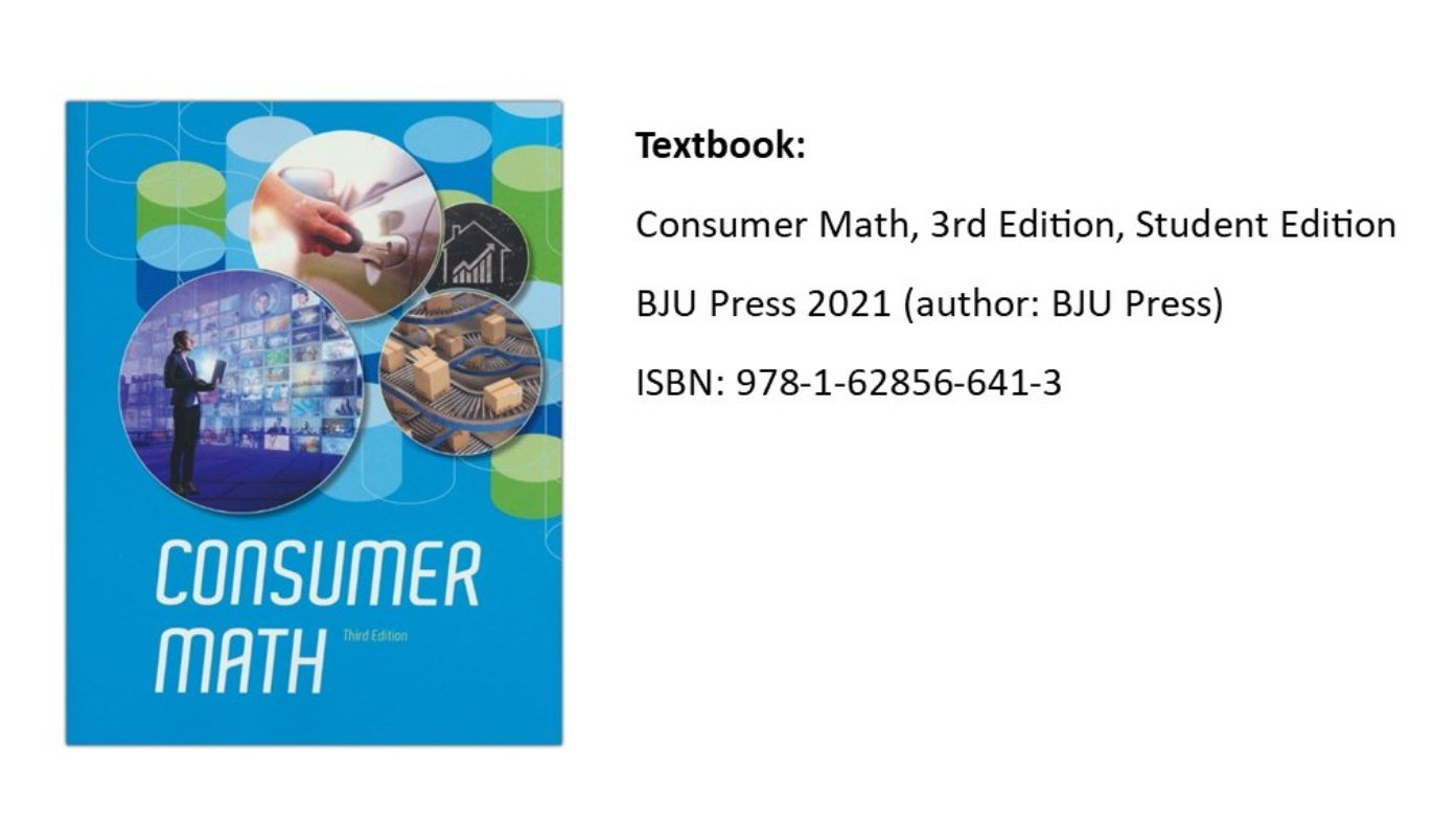 Consumer Math is a practical class covering real-life skills such as banking, budgeting, borrowing, credit cards, and income taxes; buying, renting, mortgaging, and maintaining homes; clothing and food shopping; life and health insurance; and vacation planning. Consumer Math is taught from a biblical perspective using the Bob Jones University Consumer Math textbook and incorporates biblical stewardship into every lesson.